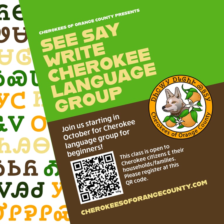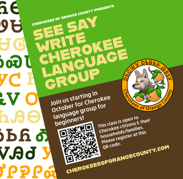 Join us for our very first Cherokees of Orange County "See Say Write" Cherokee Language Group. This class is for Cherokee citizens (Cherokee Nation, EBCI, UKB) and their families. You must provide at least one registration number per household registered.